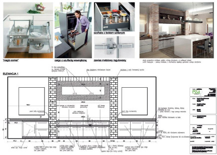 | Plansza projektu wykonawczego. Widoczne szczegółowe opisanie ściany, wizualizacja i propozycje rozwiązań meblarskich | |