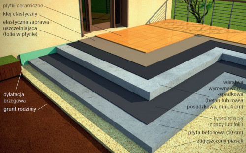 Układ warstw tarasu na płycie betonowej, wykończonego płytkami ceramicznymi