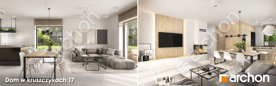 W zaproponowanej aranżacji wnętrza zastosowano jasną kolorystykę ścian i podłogi, która znakomicie współgra z drewnianymi akcentami w strefie telewizyjnej. Nowoczesnego, a zarazem przytulnego wyrazu dodają także drewniane żaluzje, dekorujące przeszklenia w strefie dziennej. Spojrzenia przyciąga efektowny kominek będący wyjątkową ozdobą wnętrza, a całość stanowi komfortową przestrzeń dla rodziny, sprzyjającą wspólnemu spędzaniu czasu.