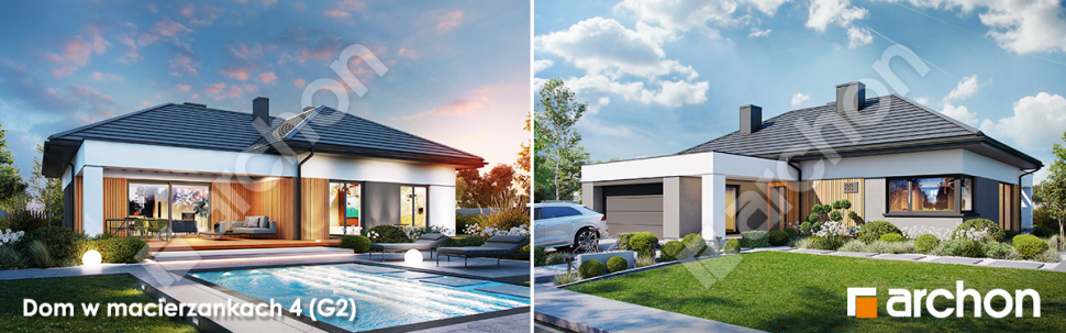 "Dom w macierzankach 4 (G2)" o powierzchni ok. 127 m2 oferuje funkcjonalny układ pomieszczeń, który spełni oczekiwania rodzin z dziećmi. Zwieńczona czterospadowym dachem bryła zwraca uwagę efektowną kompozycją wykończenia i wysuniętym do przodu dwustanowiskowym garażem. Strefa wejściowa zyskała tym samym zaciszny charakter i praktyczną osłonę, a drewniana okładzina dodaje całości naturalnego wyrazu, pięknie współgrając z jasnym i grafitowym tynkiem.