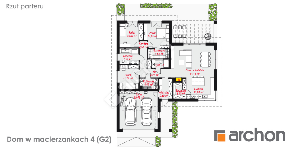 Strefa dzienna to otwarta przestrzeń, w której salon z narożną sofą zachęca do wspólnego wypoczynku przed kinem domowym, a reprezentacyjna jadalnia zachwyca szerokim widokiem na ogród. Kuchnia oferuje optymalny układ funkcji, można tutaj zaaranżować wysoką zabudowę, obszerne blaty oraz nowoczesną wyspę z wygodnym miejscem do pracy i do jedzenia. Przewidziano także praktyczną spiżarnię, ułatwiającą organizację i przechowywanie oraz narożne okno, które wprowadza do kuchni dużą ilość naturalnego światła.