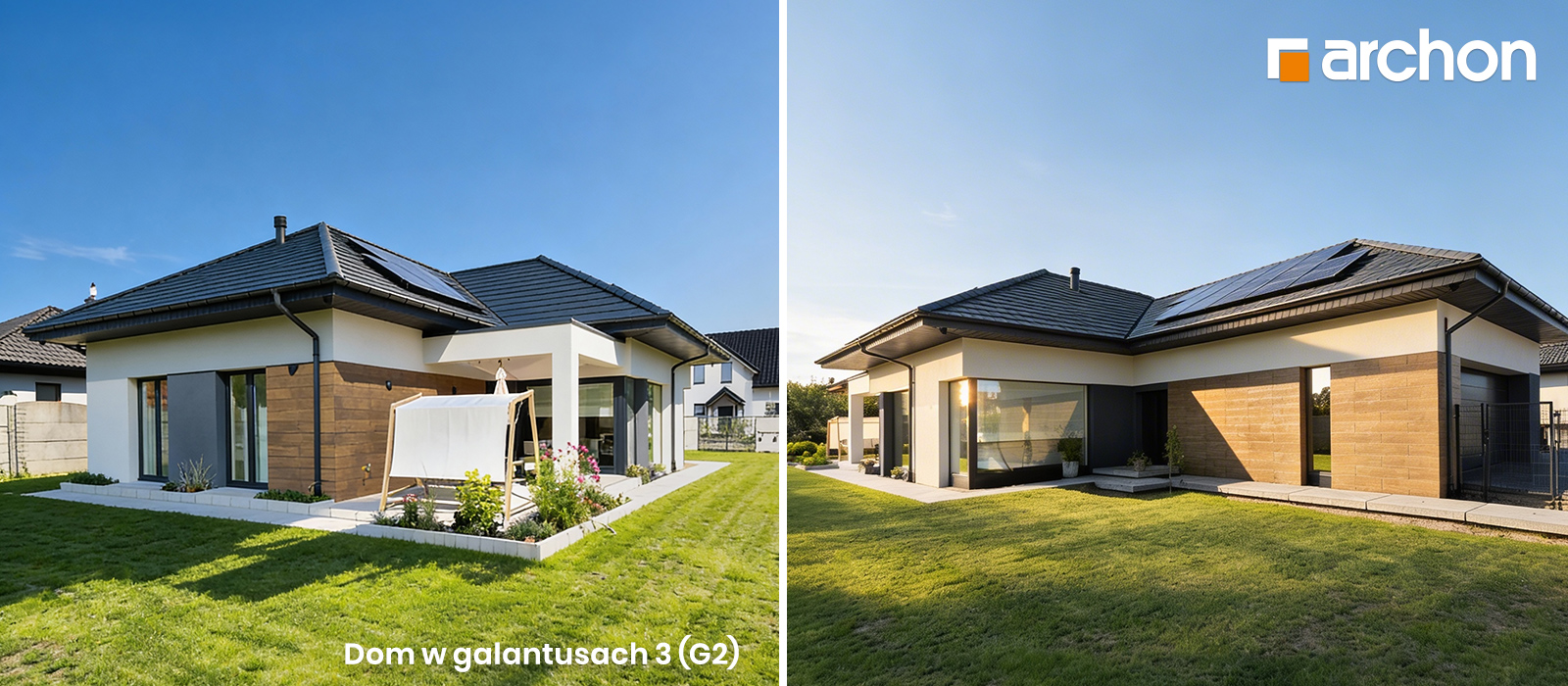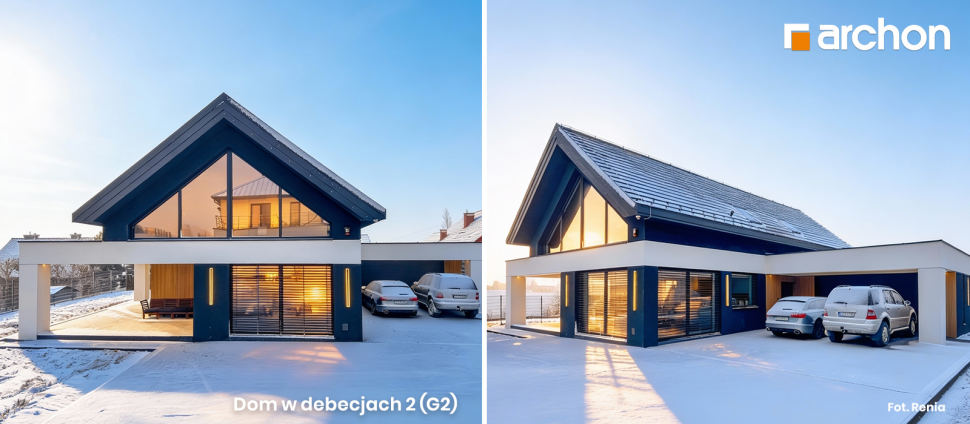 "Dom w dabecjach 2 (G2)" to efektowna realizacja, która doskonale oddaje charakter nowoczesnej architektury. Wyrazista bryła z dwuspadowym dachem i dużymi przeszkleniami przyciąga uwagę harmonijnymi proporcjami oraz dopracowanymi detalami. Szerokie przeszklenia otwierają dom na ogród i zapewniają naturalne doświetlenie wnętrz, a zadaszona strefa tarasowa stanowi harmonijne przedłużenie części dziennej.