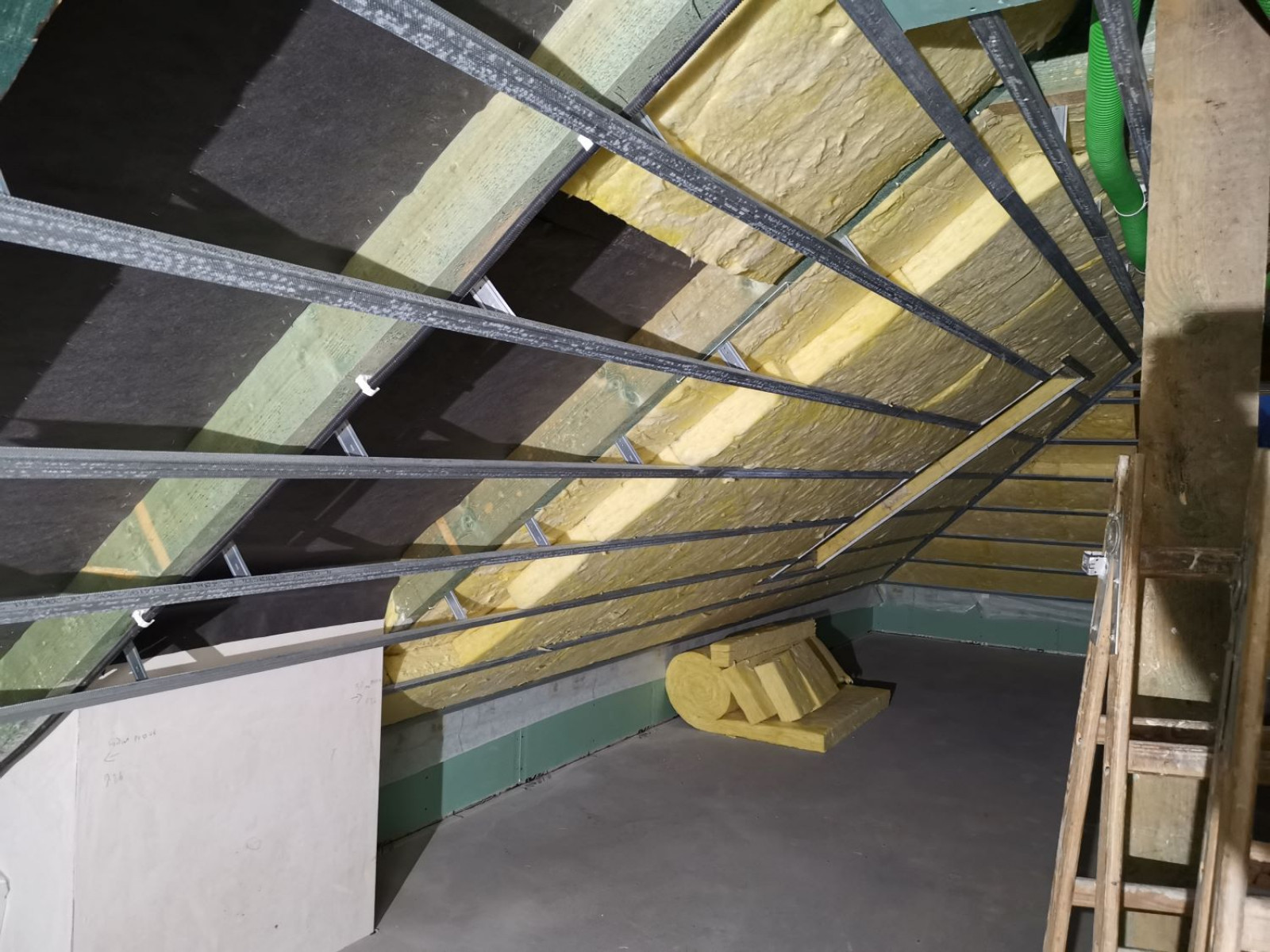 Lecz jedna warstwa wełny tylko pomiędzy krokwiami to obecnie zbyt mało do ocieplenia poddasza, gdyż te zwykle mają nie więcej niż 18 cm. Powszechnie dodaje się więc jeszcze drugą warstwę wełny - na ruszcie pod krokwiami. W nowym domu z poddasze do adaptacji, gdzie już na etapie projektu przewidziano 10-15 cm takiego dodatkowego ocieplenia, nie jest to problemem.