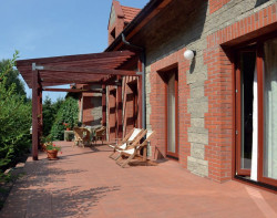 Taras ma wymiary 3,5 × 14 m. Wydzielono na nim strefę pełnego słońca i zasłoniętą pergolą. Na całej płycie i schodkach ułożono takie same płytki terakoty jak w salonie. Dzięki temu przestrzenie się uzupełniają i przenikają. Naturalny kolor terakoty dopasowano do koloru elewacji wykończonej klinkierem