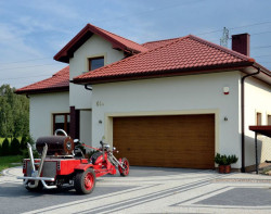 Wysunięty garaż osłania ganek i główne wejście przed zachodnimi wiatrami oraz śnieżycami. Ma to znaczenie na otwartym i wietrznym terenie. Pan Robert snuje plany wykorzystania wiatrów na potrzeby domu. Nie wyklucza budowy wiatraka. Podjazd utwardził kostką betonową, typ Naturo firmy Semmerlock
