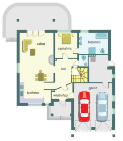 Kotłownię i garaż umieściliśmy w zachodniej części domu. Zaplanowaliśmy duży garaż, mieszczący dwa samochody oraz obszerną kotłownię, z myślą o składowaniu opału.