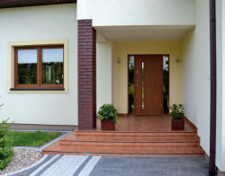 Główne wejście do budynku znajduje się w zacisznej wnęce. Właściciele wybrali drzwi z przeszkleniami, dzięki czemu w wiatrołapie jest jaśniej. Posadzkę wykończyli mrozoodpornym gresem, nawiązującym do koloru blachodachówki oraz wymurowanego z klinkierowej cegły słupa na ganku