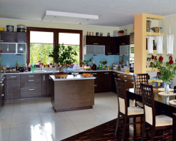 Właściciele są zadowoleni z kuchni połączonej z jadalnią i salonem. Dzięki temu podczas przyjęć mają bezpośredni kontakt z gośćmi. Wyspa na środku kuchni to dodatkowe miejsce przyrządzania potraw. Ta część domu została wyposażona w wodne ogrzewanie podłogowe i posadzkę z polerowanego gresu