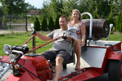 Aneta i Robert na motocyklu trójkołowym, czyli Trajce (diesel Citroën 2,0 l o długości 3,20 m, najdłuższy w Polsce), skonstruowanym od A do Z we własnym garażu.