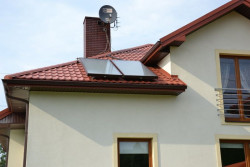 Kolektory słoneczne założono w maju 2012 r., wykorzystując do tego celu dopłatę do kredytu z projektu NFOŚiGW. Latem zastępują nowoczesny kocioł z podajnikiem i zasobnikiem na groszek węglowy w przygotowaniu ciepłej wody do użytku gospodarczego. Wodę gromadzi się w 300-litrowym zbiorniku, stojącym w kotłowni