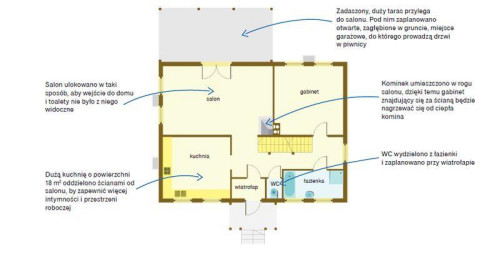 Piwnicę zagłębiono w podłożu na 120 cm. Jej ściany zabezpieczono przed wilgocią oraz ocieplono styrodurem o grub. 10 cm. Na zewnątrz wykończono łupkiem szarogłazowym. Dokoła budynku ułożono opaskę odwodniającą i odprowadzającą wodę z dachu do studni chłonnej. Na końcu usypano skarpy