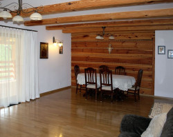 Właściciele nie chcieli, żeby drewno przytłoczyło wnętrza. Ściany zewnętrze od strony wnętrz wykończyli płytami k-g i pomalowali na biało. Tylko ściany działowe skonstruowali z bali sosnowych i omszyli ozdobnymi warkoczami z pakułów świerkowych. Podłogi wyłożyli parkietem dębowym