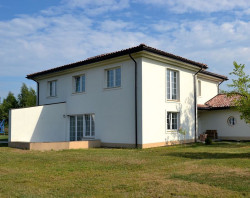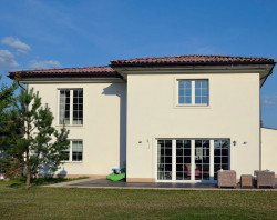 Właściciele perfekcyjnie wykorzystali miejsce na działce. Dom wznieśli blisko drogi, uzyskując dużo przestrzeni za budynkiem. Nadali mu charakter śródziemnomorskiej willi. Dach pokryli, sprowadzoną z Włoch, cieniowaną dachówką. Elewacje otynkowali tynkiem o ciepłym odcieniu bieli