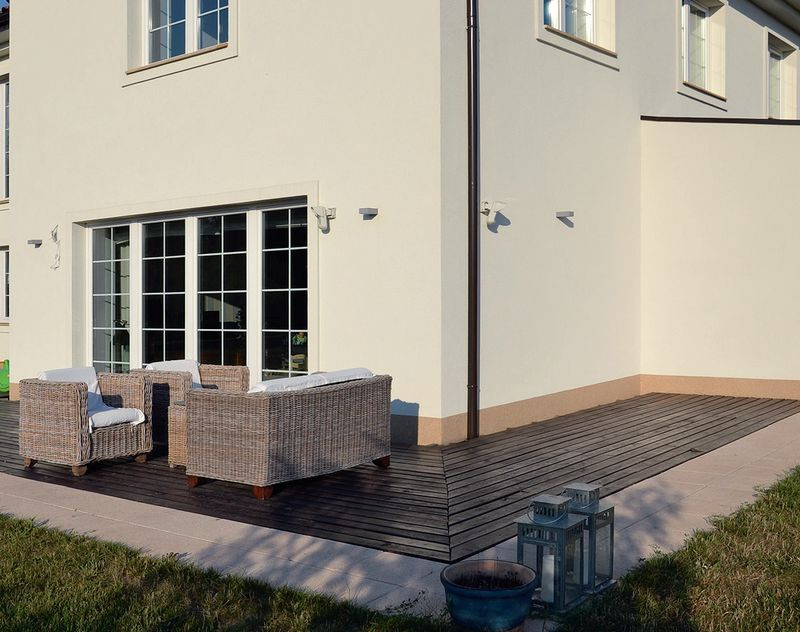 Taras znajdujący się na poziomie gruntu, wykończono płytami betonowymi oraz deskami na legarach. Poprzeczna ściana, zaburzająca zwartą bryłę budynku, ma za zadanie akumulować wiosną i jesienią ciepło od słońca oraz chronić siedzących na tarasie przed zachodnimi wiatrami