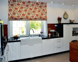Białe fronty szafek kuchennych kontrastują z czarnymi kamiennymi blatami oraz wzorzystą roletą rzymską. Po oddzieleniu ścianą, kuchnia stała się intymna i znalazło się w niej miejsce do spożywania posiłków. Nie sprawdza się w niej tylko olejowana drewniana podłoga