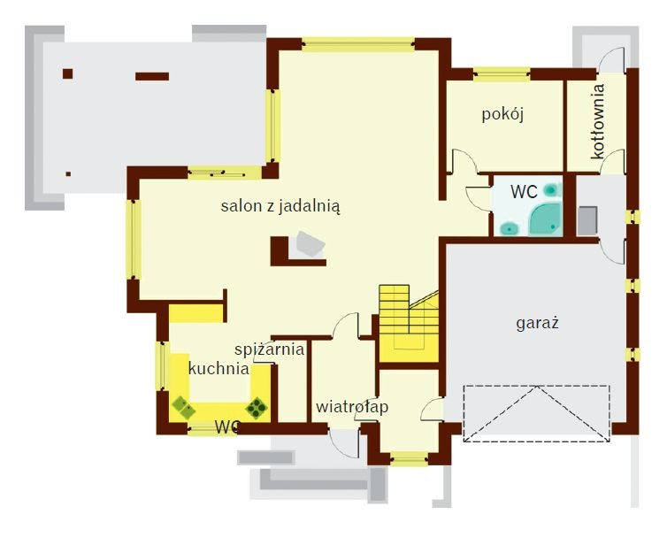 Jola i Andrzej wybrali projekt z obszernym zapleczem garażowo-gospodarczym. W kotłowni zamontowali kocioł kondensacyjny z zasobnikiem c.w.u. (150 l) oraz urządzenia do uzdatniania wody i jednostkę centralnego odkurzania. Centralę wentylacyjną umieścili na strychu. Przy kotłowni – pralnia i spiżarnia. Mają stamtąd dodatkowe wyjście do ogrodu