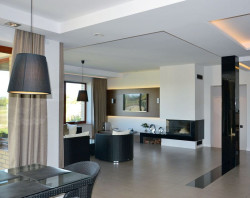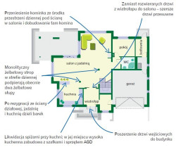 Właściciele przenieśli kominek ze środka pod ścianę salonu. Dzięki temu przestrzeń parteru wydaje się większa. Podwieszane sufity, z oświetleniem LED-owym optycznie wyznaczają funkcje. Meble z technorattanu trafią na stałe do ogrodu, a zastąpią je nowoczesne kanapy i jadalnia z drewna