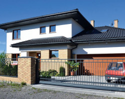 Budynek usytuowano na działce w taki sposób, aby przed frontem powstał wąski ogródek, natomiast za domem możliwie największa strefa wypoczynkowa. Dlatego właściciele wybrali projekt z cofniętym garażem. Szeroka samonośna brama przesuwna ułatwia wjazd samochodami na działkę z wąskiej ulicy