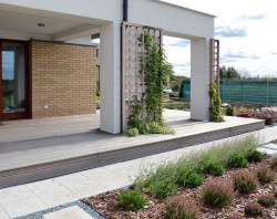 Taras ma ponad 49 m2 powierzchni i jest w połowie zadaszony. W podcieniu ustawia się meble z technorattanu. Podest wykonano z ryflowanych desek z drewna egzotycznego, które raz w roku jest malowane specjalnym olejem. W podeście, przy filarach, wycięto otwory, w których posadzono pnącza