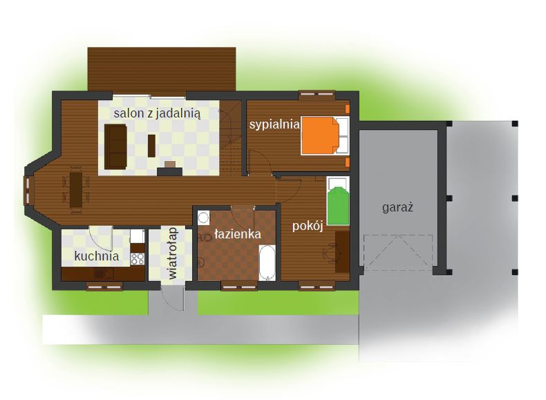 Na dolnej kondygnacji budynku, jedynymi oddzielnymi pomieszczeniami są: pokój gościnny, gabinet oraz łazienka. Reszta, czyli salon, jadalnia w wykuszu, kuchnia i sień są połączone. Poddasze obejmuje: sypialnię małżeńską z garderobą, wspólny pokój córek oraz łazienkę. Pod dachem domu umieszczono garaż na jeden samochód oraz wiatę na drugi.