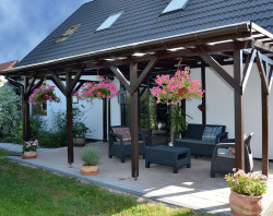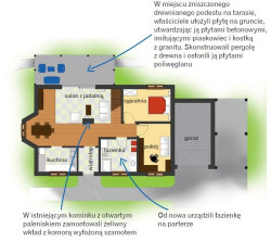 Taras (16,5 m2), powstał według pomysłu Eweliny i Łukasza. Posadzkę na gruncie utwardzono płytami betonowymi, imitującymi piaskowiec i kostki z granitu. Nad płytą skonstruowano drewnianą pergolę, którą od góry osłonięto płytami z poliwęglanu. Dzięki zadaszeniu, na taras dociera światło i nie mokną meble
