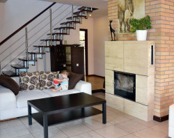 W istniejącym otwartym palenisku, zamontowano żeliwny wkład o mocy 12 kW, z komorą wyłożoną szamotem. Do komina z cegły klinkierowej dodano nagrzewającą się obudowę z płyt aglomarmuru. Choć kominek nie ma systemu DGP, zapewnia komfort cieplny w pomieszczeniach dziennych i w pokoju córek na poddaszu