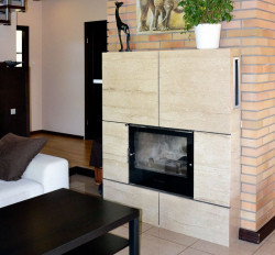 W 2012 r. w istniejącym otwartym palenisku właściciele zamontowali żeliwny wkład z komorą wyłożoną szamotem oraz wykonali wokół niego obudowę z płyt aglomarmuru, która szybko się nagrzewa. Na poddaszu komin obłożyli płytkami z piaskowca, również odbierającymi ciepło. Codzienne rozpalanie ognia w kominku sprawia, że temperatura we wnętrzach wzrasta o 2–3 stopnie i jest bardziej komfortowa dla domowników. Wodę użytkową ogrzewa się w zasobniku o poj. 100 l.