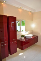 Ewelina i Łukasz zdecydowali się na generalny remont łazienki na parterze, ponieważ poprzednia nie była dobrze wyposażona i urządzona. Na ścianach i posadzce ułożyli płyty jasnego matowego gresu. Zamontowali nowe urządzenia sanitarne, w tym kabinę ze szkła. Wstawili nowe pojemne meble, wykonane na zamówienie. Ich kolor kontrastuje z gresem