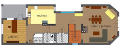 Na parterze wszystkie wnętrza, umieszczone w układzie amfiladowym, są połączone. Wyjątek stanowią jedynie oddzielone i zamykane drzwiami: łazienka, garderoba i kotłownia. Połączenie wnętrz ma ułatwiać przyszłym pracownikom firmy wzajemny kontakt wzrokowy i słowny. Duży wiatrołap przeznaczony jest docelowo do przyjmowania interesantów, natomiast obecny salon łatwo można będzie zmienić w biuro ze stołem konferencyjnym. Kuchnia już została przygotowana do roli aneksu socjalnego.