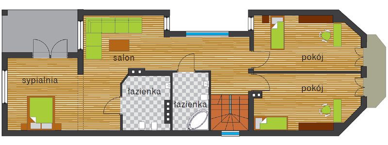 Para zrezygnowała z realizacji gotowego projektu i zaprojektowała inny dom w podłużnym kształcie, wspólnie z architektem Andrzejem Strużewskim. Położyła nacisk na przygotowanie przyszłych stanowisk do pracy, zaopatrując wskazane miejsca w budynku w odpowiednią ilość np. gniazd elektrycznych, ale pomyślała również o takiej liczbie i wielkości pokojów oraz łazienek na poddaszu, żeby mogły spełniać funkcje prywatne. Na poddaszu rodzina ma do dyspozycji 4 pokoje oraz 2 łazienki.