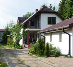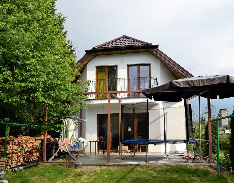 Dom murowany, parterowy z poddaszem i wolno stojącym garażem; dwuwarstwowe ściany z pustaków ceramicznych Porotherm i styropianu o gr. 16 cm; dach pokryty blachodachówką. Powierzchnia działki: 700 m2. Powierzchnia domu: 240 m2. Powierzchnia garażu: 36 m2. Roczne koszty utrzymania budynku: około 9000 zł.