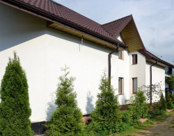 Ściany budynku, wzniesione z pustaków ceramicznych i zaizolowanych na zewnątrz styropianem o gr. 16 cm, zostały wykończone nietypowo – tynkiem ze specjalnego gipsu zewnętrznego, który pomalowano farbą fasadową w kolorze białym. Dach pokryto blachodachówką w kolorze brązowym