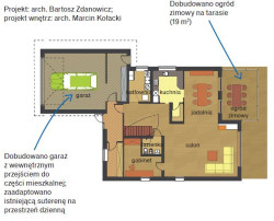 Posiadając działkę o szerokości jedynie 21 m, właściciele poprosili architektów o zgrabne zaprojektowanie garażu z aneksem gospodarczym i połączenie go z częścią mieszkalną. Garaż na dwa samochody dobudowano od frontu budynku. Na poziomie dawnej sutereny, Kamila i Andrzej zorganizowali strefę dzienną. Tu właśnie – a nie, jak poprzednicy, na wysokości piętra umieścili główne wejście do budynku, duży wiatrołap (6,2 m2), a przy nim oddzieloną szatnię (5,6 m2).