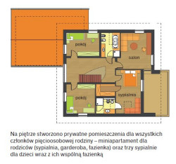 Nie wahali się połączyć jadalni z salonem i holem, bo razem ich przestrzeń wydaje się większa. Resztę pomieszczeń woleli jednak oddzielić. Kuchnię ze spiżarnią zamknęli przesuwanymi drzwiami, zwykłymi natomiast – gabinet z biblioteką oraz WC z prysznicem. Całkowicie prywatna strefa zajmuje piętro. Każde z trojga dzieci ma tu własny pokój, ale korzysta ze wspólnej łazienki. Rodzice natomiast urządzili dla siebie miniapartament z sypialnią, łazienką i garderobą.