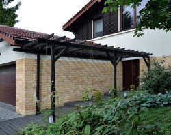 Elewacje wykończono tynkiem akrylowym, okładziną z piaskowca (na wysokości parteru) oraz z modrzewia syberyjskiego (na wysokości piętra). Na dachu ułożono ceramiczną angobowaną dachówkę, natomiast na podjeździe do garażu – granitową kostkę. Schody pod pergolą wykonano z czarnego łupka