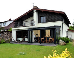 Z tarasu i z balkonu roztacza się panorama na ogród. Taras za domem o powierzchni 55 m2 wykończono ryflowanymi deskami z drewna egzotycznego. Pierwotnie tylko wzdłuż okna w salonie osłonięto go markizą. Drugą założono po dobudowaniu ogrodu zimowego, nad jego przeszklonym dachem