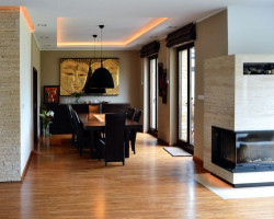 Jadalnia, salon i hol są połączone i ułożono w nich jednakowy parkiet przemysłowy z teku, przeznaczony do ogrzewania podłogowego. Na ścianach, tuż nad parkietem, poprowadzono instalację nocnego oświetlenia z czujnikami ruchu. Meble w jadalni wykonano na zamówienie z drewna ipe