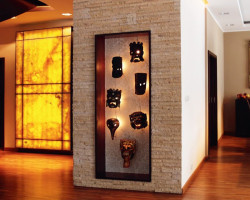Kolekcję masek z podróży po świecie wyeksponowano w specjalnie zbudowanych i podświetlonych wnękach w ścianie holu i salonu. Ciekawy efekt dekoracyjny i świetlny daje panel wykonany z tafli onyksu, który ciepłym miodowym światłem rozjaśnia hol z klatką schodową