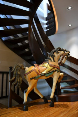 Pan domu chciał mieć drewniane schody wykonane jak dobry mebel. Sam je zaprojektował, a wykonanie z drewna meranti zlecił stolarzowi. Rok temu w holu na parterze pojawiła się rzeźba z drewna, sprowadzona z Indonezji, która podkreśla dynamiczną architekturę klatki schodowej