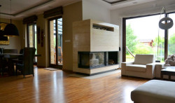 Wkład kominkowy z płaszczem wodnym i z narożną szybą (wykonany na zamówienie) obudowano płytami jasnego trawertynu oraz czarnego marmuru. Choć system grzewczy głównie napędza kondensacyjny kocioł na gaz z sieci, kominek, potrafiący ogrzać cały dom poprzez wodną instalację podłogową, okazał się przydatnym urządzeniem. Nawet wtedy, gdy pali się w nim dla przyjemności