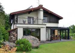 Właściciele, dobierając domowe instalacje i urządzenia, postawili na nowoczesność. Budynek, cały wyposażony w wodną instalację podłogową, ogrzewają kondensacyjnym kotłem na gaz z sieci, albo kominkiem z płaszczem wodnym i drewnem. Tylko dobudowany niedawno ogród zimowy zaopatrzyli w piec akumulacyjny na pellety, którego nie powiązali z resztą instalacji c.o. Latem wodę użytkową przygotowują płaskie kolektory słoneczne.