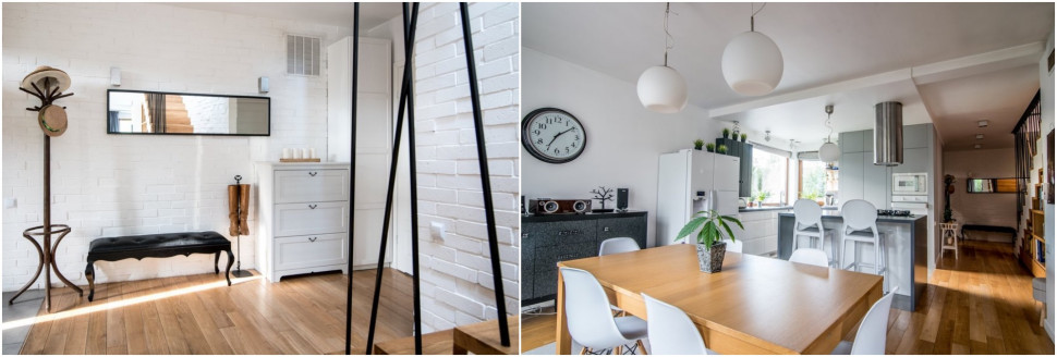 W miejscowości, w której zamieszkali Agnieszka i Paweł, większość domów ma ukośne dachy i nieskomplikowane bryły z wysuniętymi frontalnymi gankami z kolumnami. Ich dom także zawiera podobne elementy, tyle że większość z nich przeszła przez nowoczesną architektoniczną transformację.