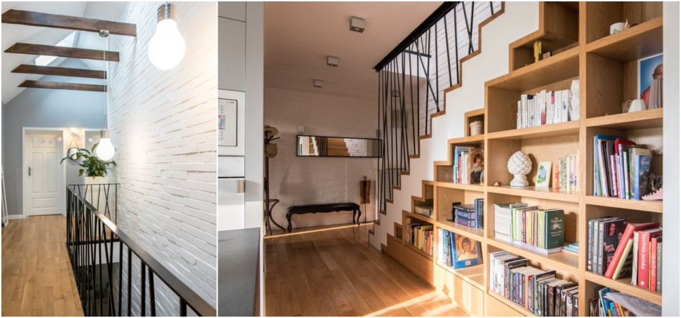 Jednobiegowe wejście na poddasze, poprowadzone w samym środku przestrzeni mieszkalnej, wykończono schodami dywanowymi z drewna dębowego oraz ażurową balustradą z prętów stalowych. Elementem dopełniającym jest ściana, w której cegły celowo ułożono w taki sposób, żeby osiągnąć efekt 3D.