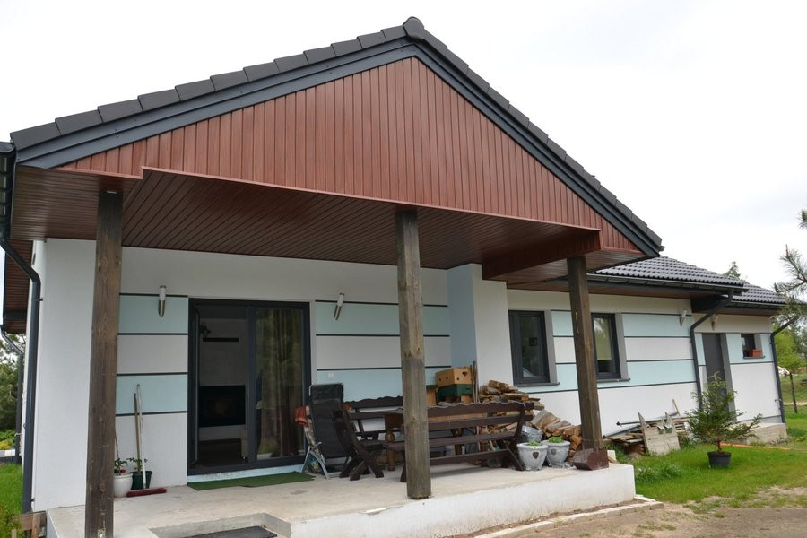 Parterowy dom ma tak prostą bryłę, że właścicielka postanowiła uatrakcyjnić ją elewacją. Obok okładziny z kamienia, zdobiącej główną strefę wejściową, dodała boniowanie wykończone białym i błękitnym tynkiem. Ze względu na pobliskie pola, które są orane, zastosowała tynk silikonowy (można łatwo umyć go z kurzu myjką ciśnieniową). Podmurówkę wykończyła marmolitem.