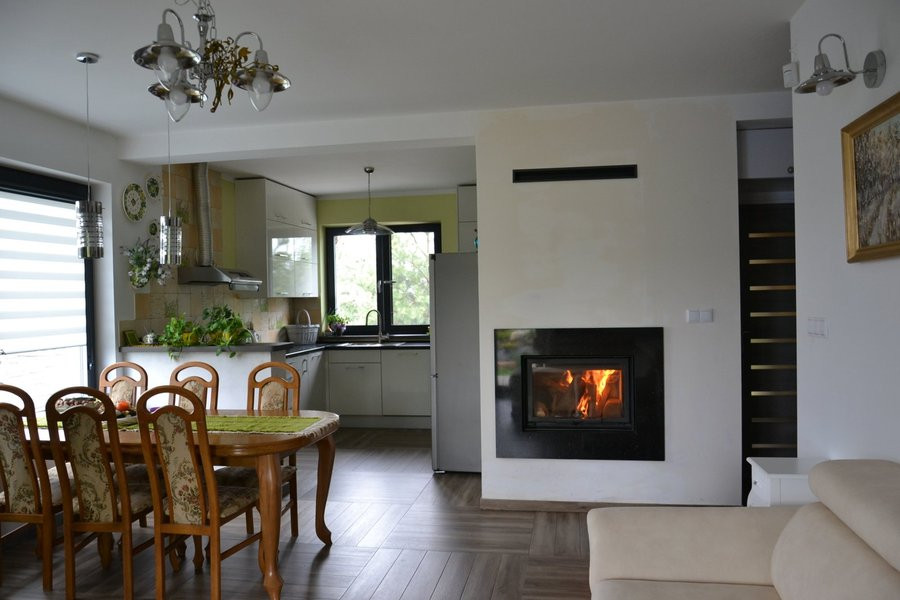 Kominek o mocy 12 kW ma komorę wyłożoną szamotem, podnoszoną szybę, mechaniczny system DGP, rozprowadzający ciepło do sypialni i łazienek, oraz obudowę z granitu i ognioodpornych płyt g-k.