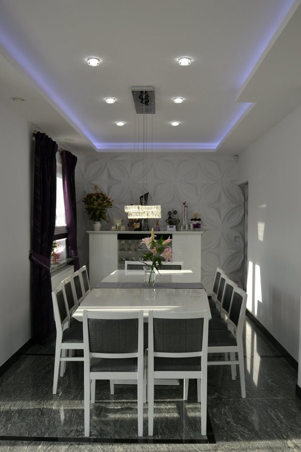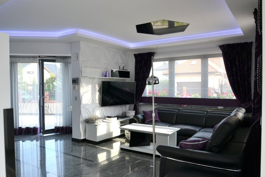 Wszystkie pomieszczenia ozdobiła efektownym oświetleniem. Najnowocześniejsze rozwiązania, m.in. sufity napinane typu gwiaździste niebo, dekorują salon i jadalnię. Dopracowywanie, wraz z architektką wnętrz, detali zajęło dużo czasu, jednak właścicielom zależało na staranności i nie przyspieszali toku prac projektowych, ani wykończeniowych.