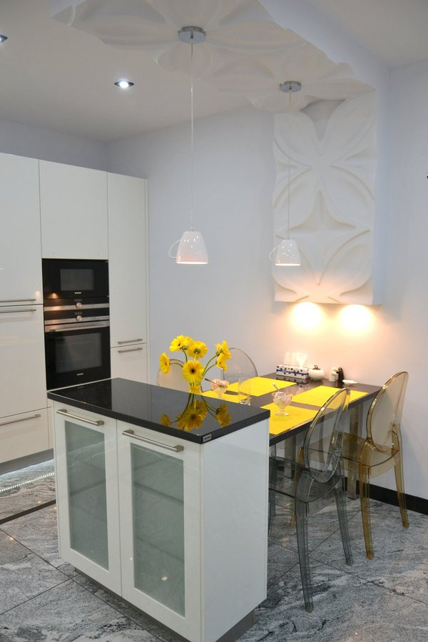 Kuchnia jest przestronna i ma okno skierowane na północ. Są w niej nowoczesne urządzenia kuchenne (szczególnie praktyczna okazuje się płyta indukcyjna o szer. 90 cm, z pięcioma palnikami) oraz świetnie wyposażone szuflady, szafki i cargo. Z zabudową kuchenną w kolorze białym kontrastuje blat z czarnego granitu i czarne hartowane szkło (na ścianie nad blatem). Biało-szaro-czarną kolorystykę ożywiają żółte dodatki.