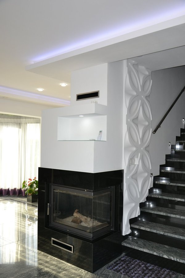 Schody na klatce schodowej obrobiono identycznym kamieniem jak na podłodze. W posadzce strefy dziennej oprócz podłogówki pracują jeszcze grzejniki kanałowe, a na ścianach grzejniki ozdobne, np. przy wejściu do kuchni (w głębi). Balustradę wykonano ze stali i szkła. W tej strefie przewidziano białe dekoracyjne panele ścienne 3D. Po lewej, przy schodach, znajduje się kominek z żeliwnym wkładem, od którego poprowadzono rury DGP (skierowano je na parter i do trzech sypialni na poddaszu).