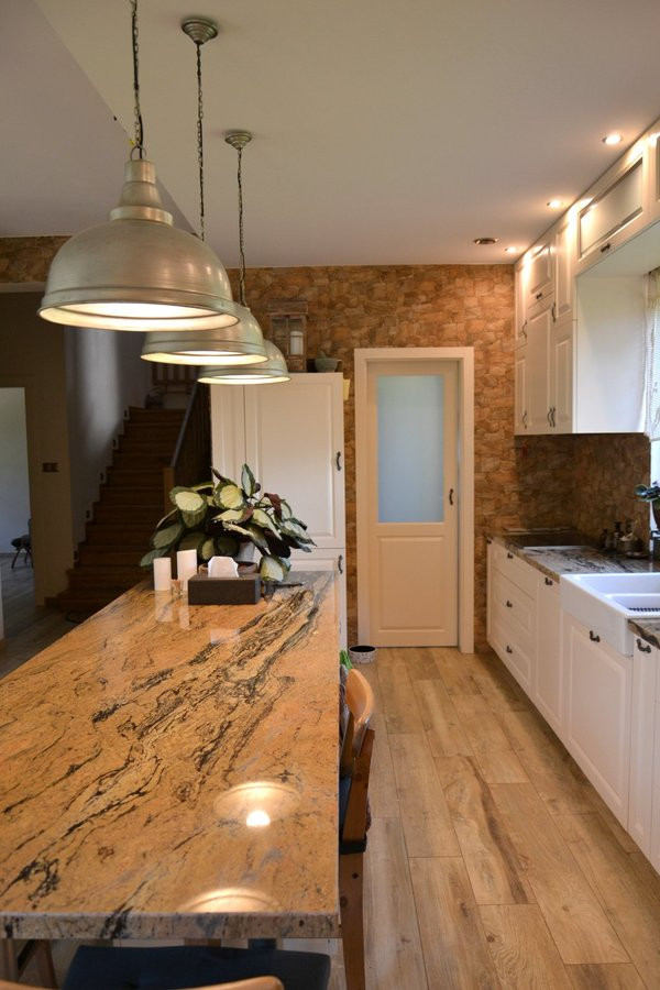 W kuchni wykonano liniową zabudowę z lakierowanych płyt MDF i wyspę o wym. 270 × 90 cm. Szeroki granitowy blat na wyspie znakomicie zastępuje stół jadalniany, bo może przy nim zasiąść kilka osób. Małżonkowie są zadowoleni, że zastosowali tu granit, a nie drewno, jak pierwotnie planowali. Drzwi w głębi prowadzą do spiżarni o wym. 210 × 157 cm.