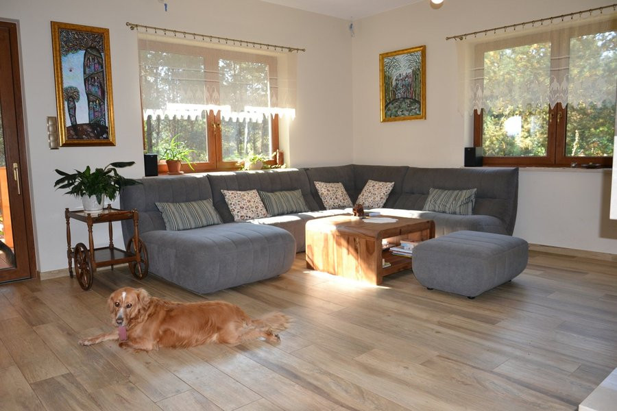 Na zewnątrz i wewnątrz budynku wszystko ma styl tradycyjny, bo małżonkom zależało na harmonijnym połączeniu architektury z otoczeniem. Klasyczne są bryła przykryta dwuspadowym dachem, układ wnętrz, materiały wykończeniowe.